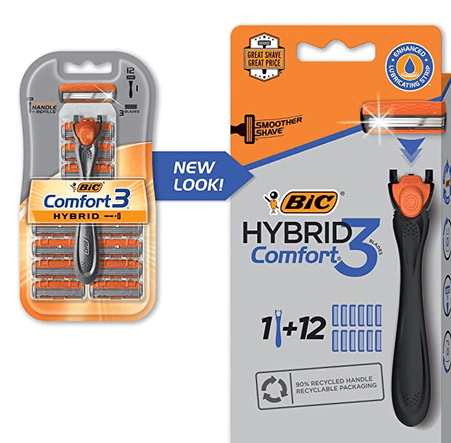 BIC Comfort 3 Hybrid Men’s Disposable Razor, 3 Blades, 12 Cartridges and 1 Handle, Black