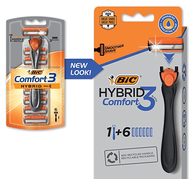 BIC Comfort 3 Hybrid Men’s Disposable Razor, 3 Blades, 6 Cartridges and 1 Handle, Black